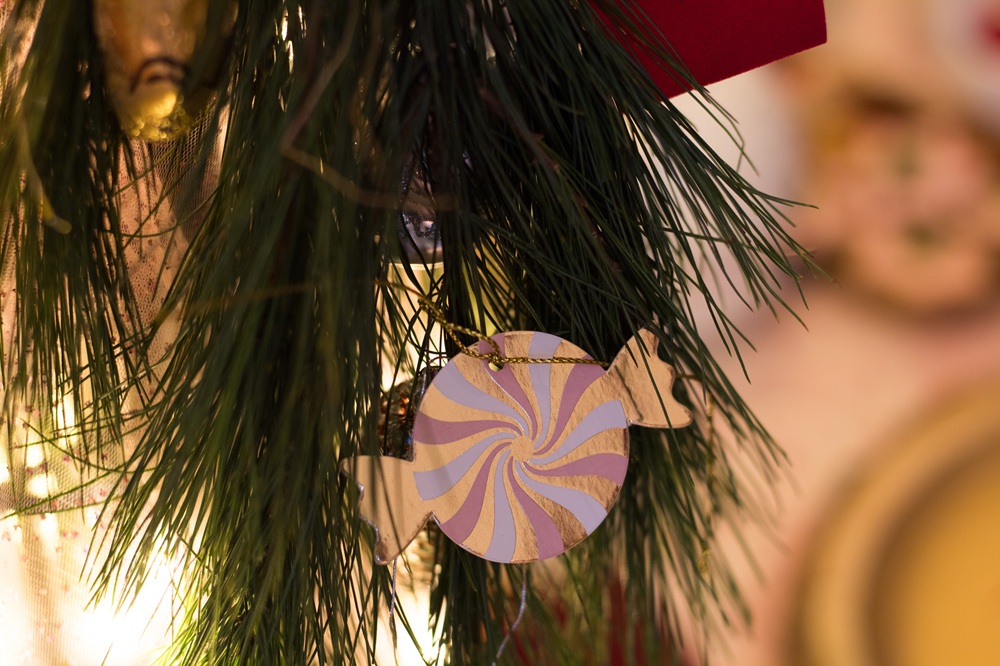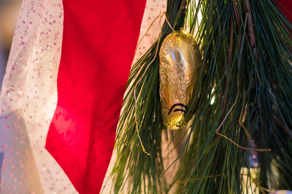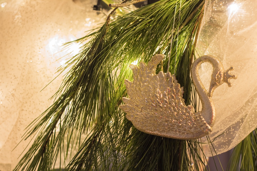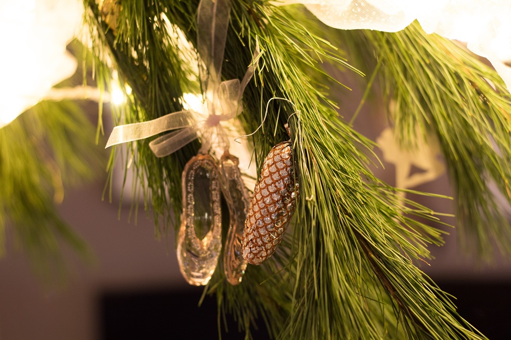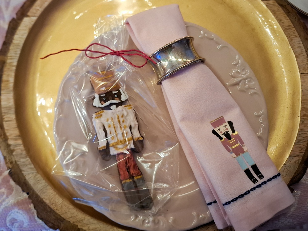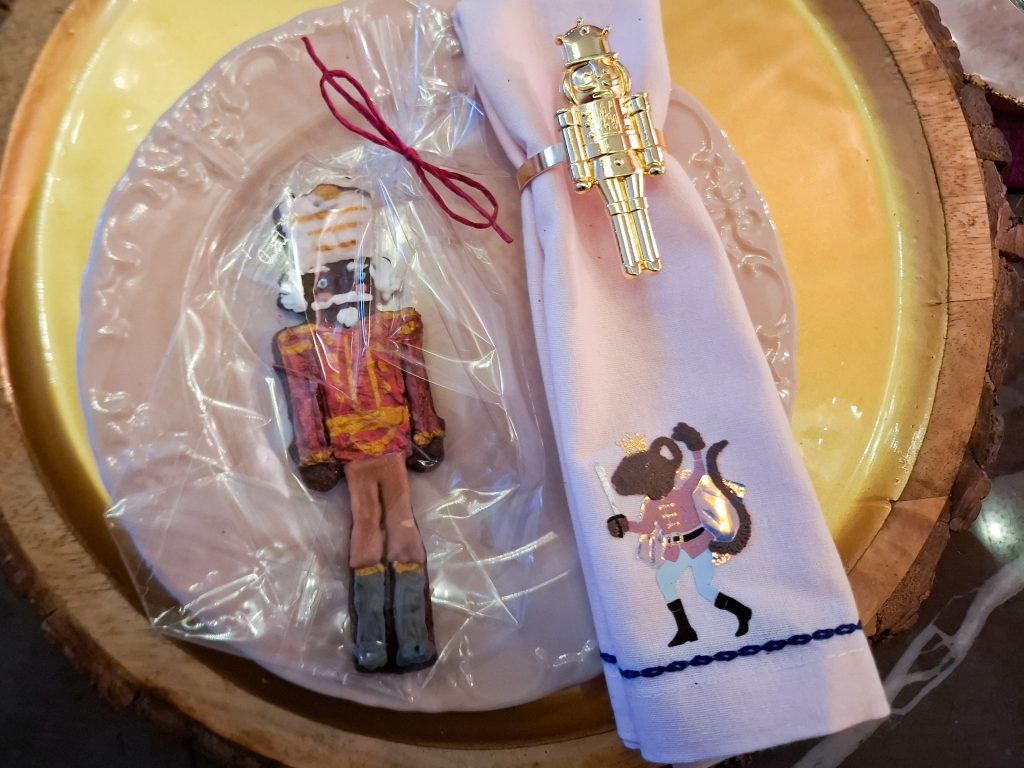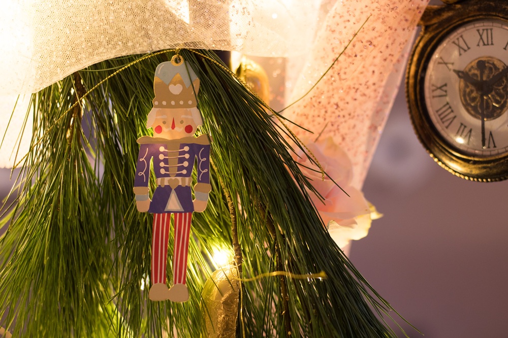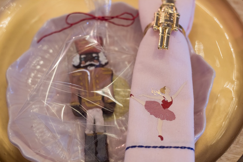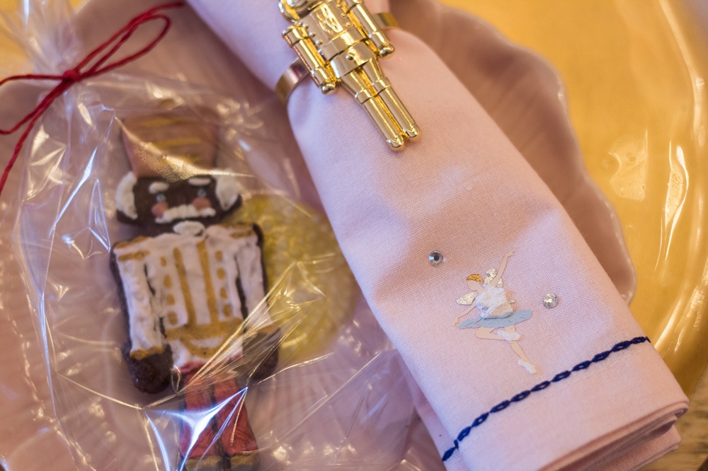 Neben Onkel Drosselmeiers Uhr habe ich Glitzerschwäne, Ballettschuhe sowie Schwäne, Nussknacker, Zuckerfeen und Bonbons aus Papier, Glasschwäne und kleine Mäuse und Tannenzapfen aus Schokolade aufgehängt. Die Servietten habe ich selbst beplottet mit den Motiven, die ich auch schon auf die Weihnachtskissen gemacht habe.