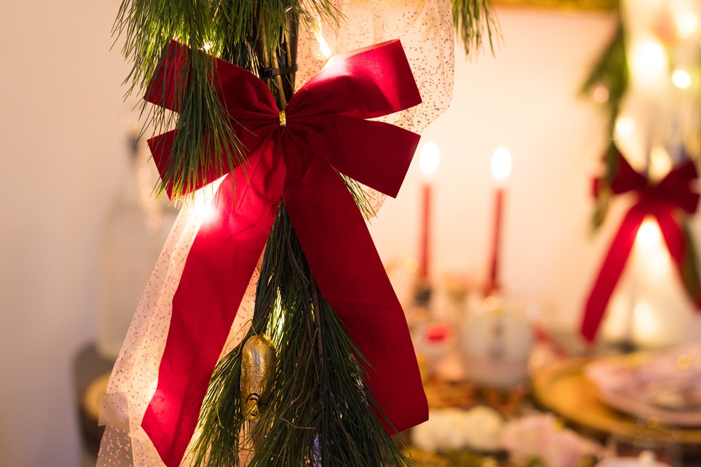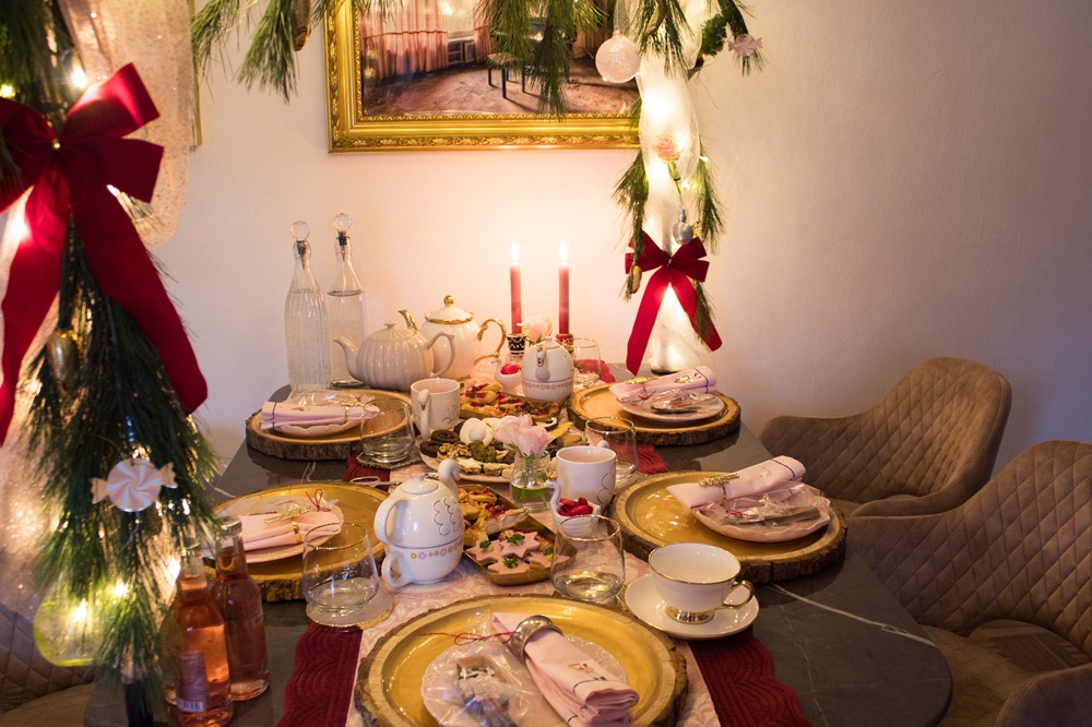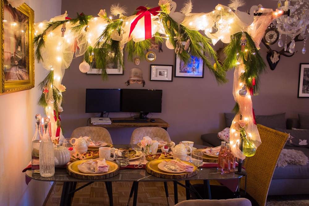 Am vierten Adventssonntag habe ich meine Familie zu Häppchen, Plätzchen, Punsch und Glühwein eingeladen. Wie auch schon zu meinem Geburtstag und beim Herbstmenü habe ich den Tisch mit einer Dekostange dekoriert. Neben einer Lichterkette, Glitzertüll und Kiefernzweigen habe ich Schleifen und kleine Figuren zum Thema Nussknacker und Schwanensee angebracht.