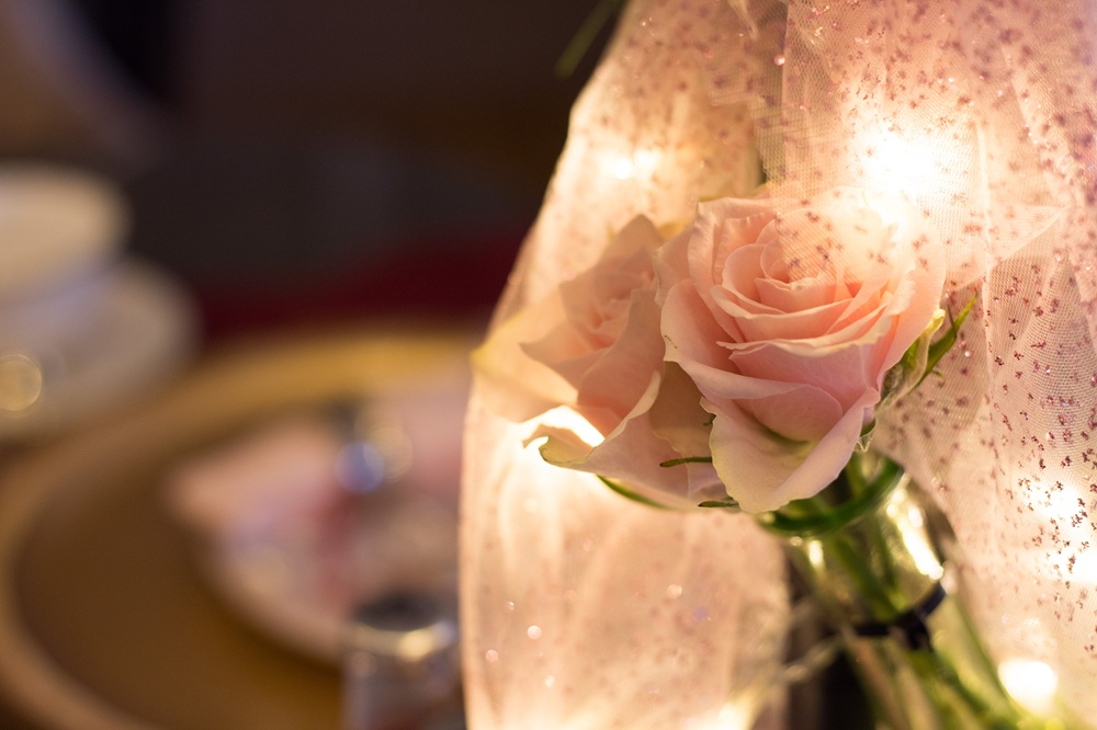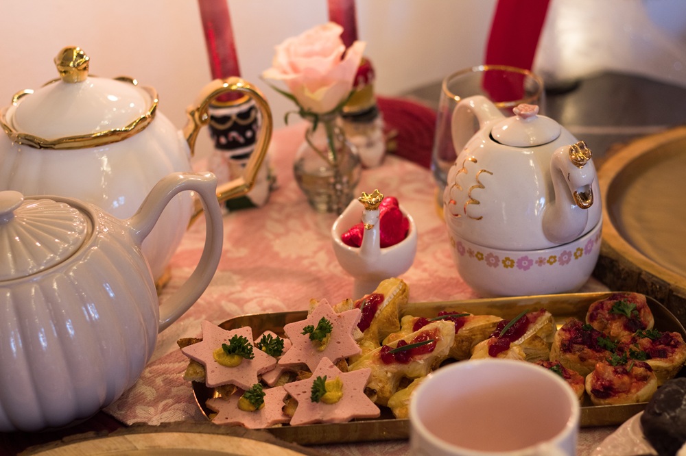 Auf meinen roten Samttischläufer habe ich einen zweiten, rosafarbenen gelegt, in den Schwäne eingewebt sind. Mit rosa Rosen und Kerzenhalter als Nussknacker habe ich den Tisch dekoriert. Passend zum Thema habe ich auch einige Geschirrteile mit Schwänen, wie Tassen und kleine Teekännchen, in Schwaneneierbecher habe ich kleine Schokoladen in Herzform gefüllt.
