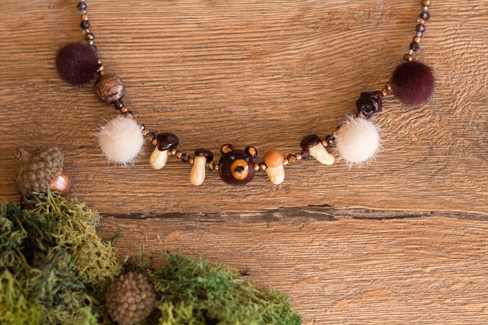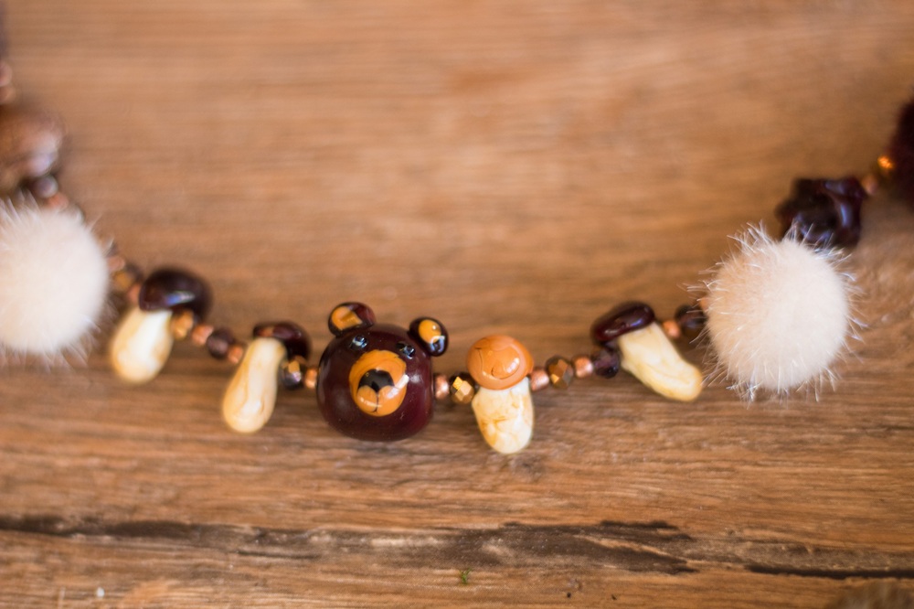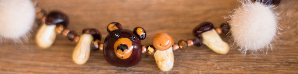 Bei meinem letzten Besuch in der Glasperlenwerkstatt habe ich neben vielen Beeren, die ich in diesem Armband verarbeitet habe, auch die Perlen für eine herbstliche Bärenkette gemacht. Es wurden ein Bärenkopf und vier kleine Pilze, außerdem hatte ich mich an einem Kiefernzapfen versucht, der allerdings nicht so schön geworden ist. Der Bär war am schwierigsten, da ich hier relativ filigran arbeiten musste, jedoch in der Flamme die Farben nicht gut gesehen habe. Es war ein Versehen, dass ich die Nase etwas nach unten gezogen habe, das sieht jetzt aber wie ein Mund aus und gefällt mir ganz gut.