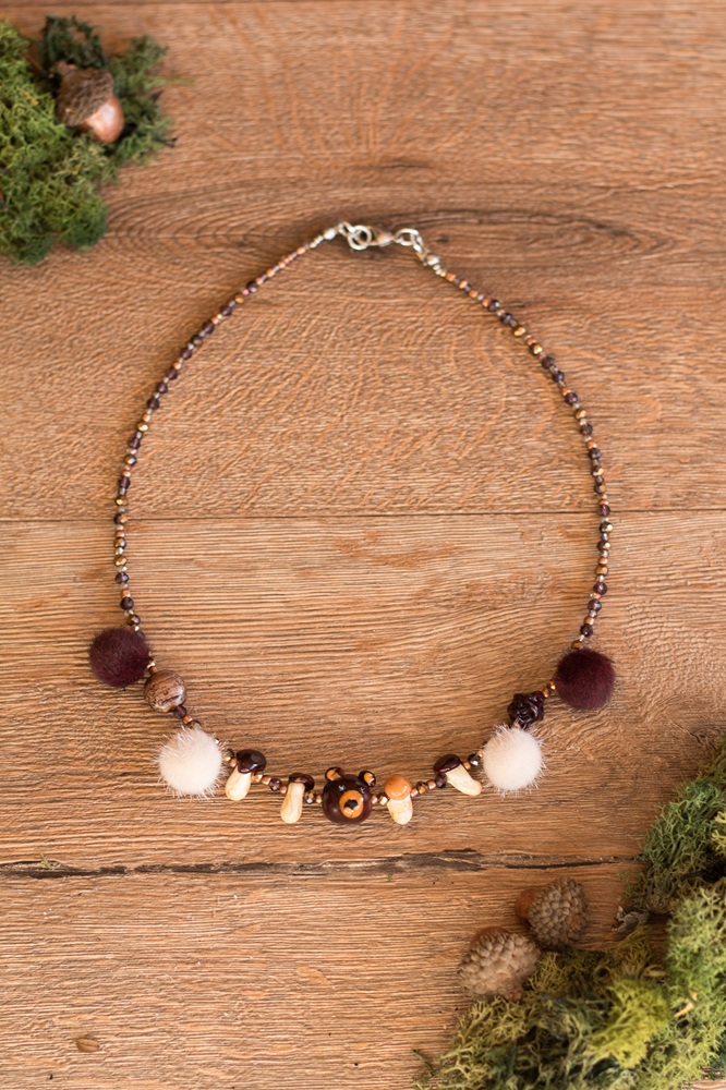 Die fertigen Perlen habe ich mit Kunstfellpuscheln und Glasperlen in verschiedenen Brauntönen auf einen Draht aufgezogen, so kann ich sie im Herbst als Kette tragen.