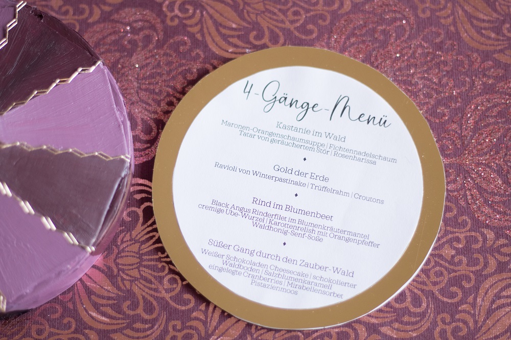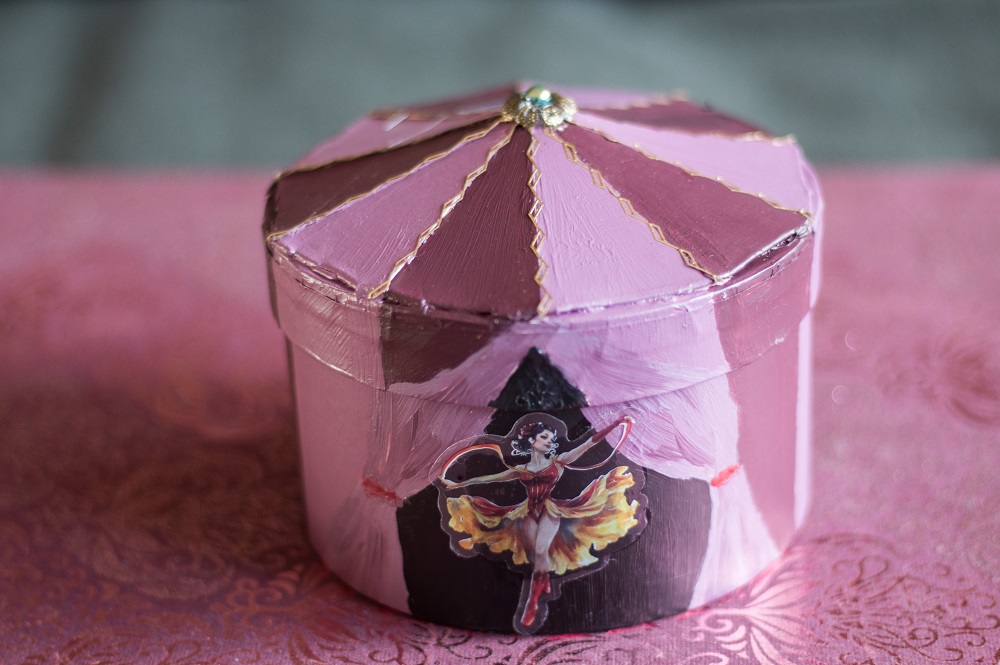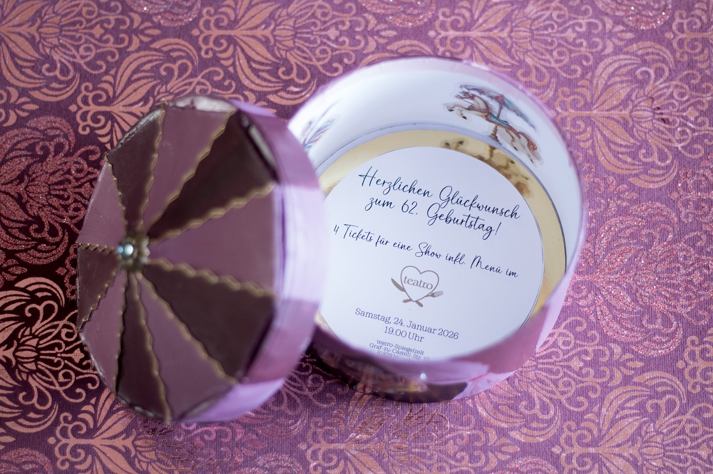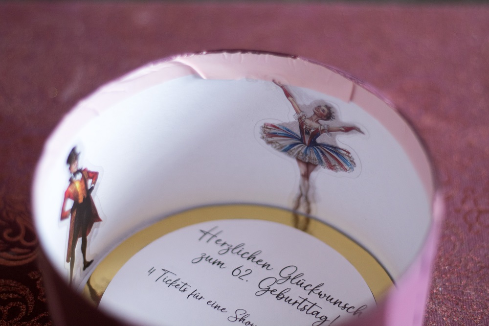 Schon im letzten Jahr haben wir unserer Mutter einen Gutschein für eine Dinnershow in München geschenkt und weil es so schön war, gehen wir im Januar wieder hin. Diesmal habe ich das Zelt in Form einer Dose gebastelt, in der die Einladung inkl. Menü verpackt ist. Damit aus dem Deckel der Dose ein Zeltdach wird, habe ich einzelne Pappdreiecke, in der gleichen Technik wie bei diesem Karussell, aneinandergeklebt. Bemalt mit Acrylfyrbe und beklebt mit goldenen Bordüren und Zirkus-Stickern, haben wir die Dose verschenkt.