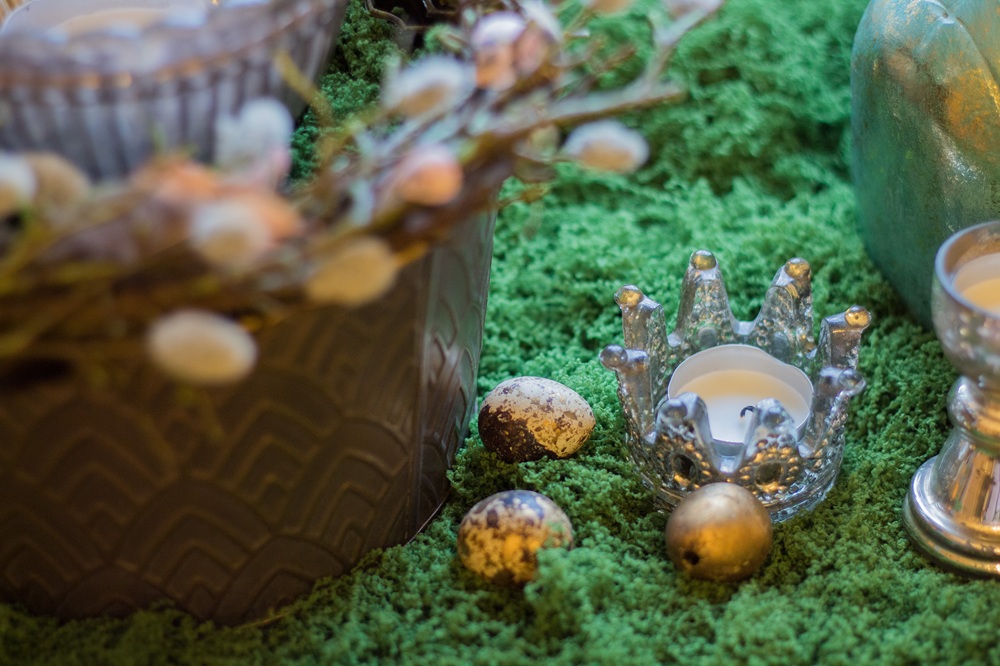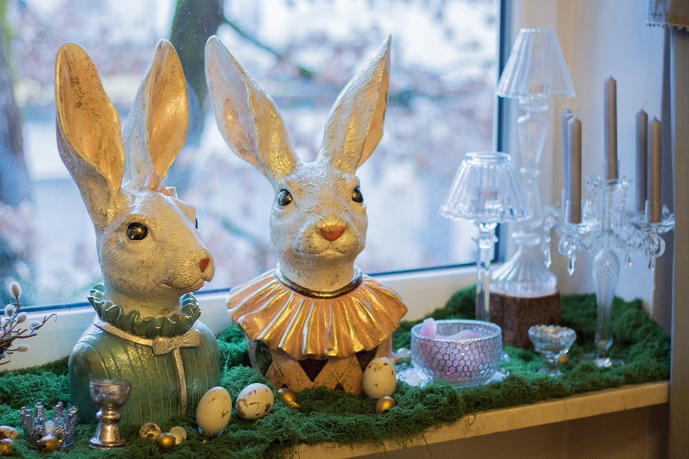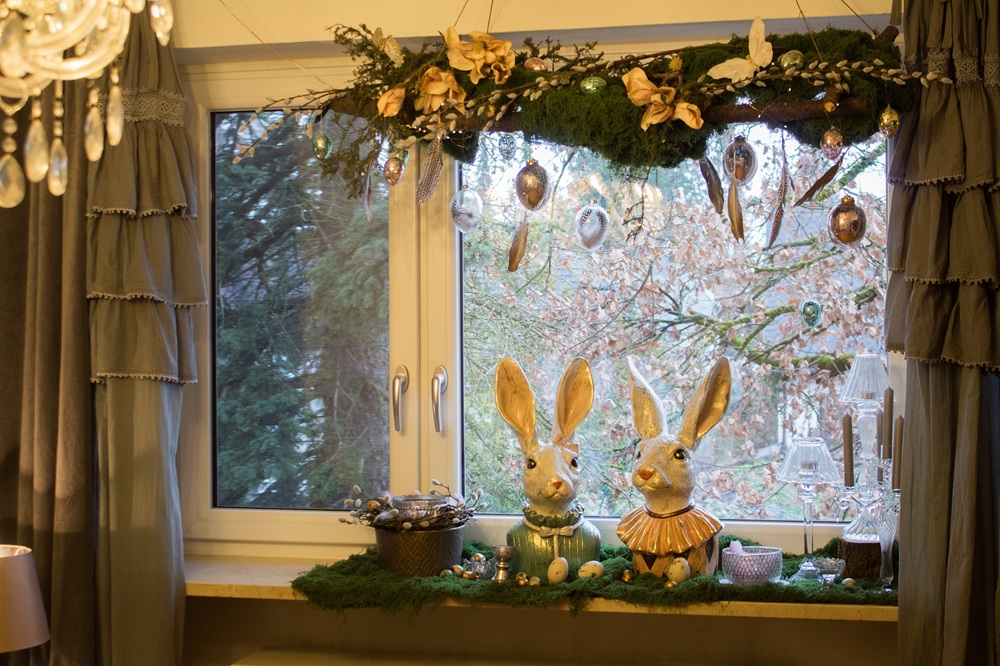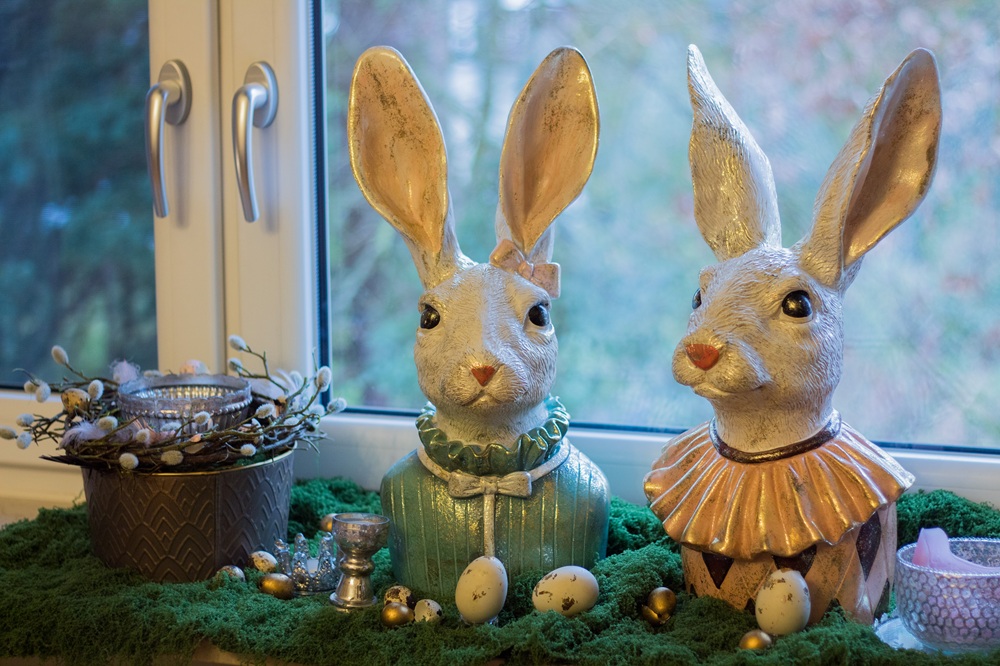 Mein Repertoire an Osterdekorationen ist nun um zwei für mich wertvolle Stücke reicher: Ich habe diese beiden Hasen bekommen, die offiziell Heinz und Heidi heißen und mit je ca. 40 cm wirklich was hermachen. Heinz und Heidi sind also in diesem Jahr die Centerpieces meiner Osterdekoration, um die herum ich alles geplant habe. Dazu habe ich zuerst textiles Moos auf der Fensterbank und in meiner Leiter an der Gardinenstange drapiert. Neben Heinz und Heidi stehen gläserne Kerzenleuchter, auf der anderen Seite eine Schale mit einem Windlicht. Goldfarbene Wachteleier sowie drei grüne Eier unserer früheren Henne Frida habe ich ebenfalls auf der Fensterbank dekoriert.