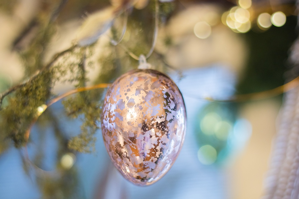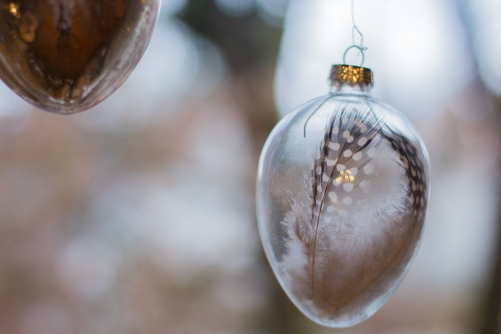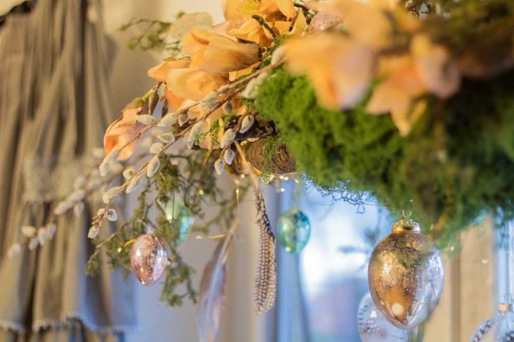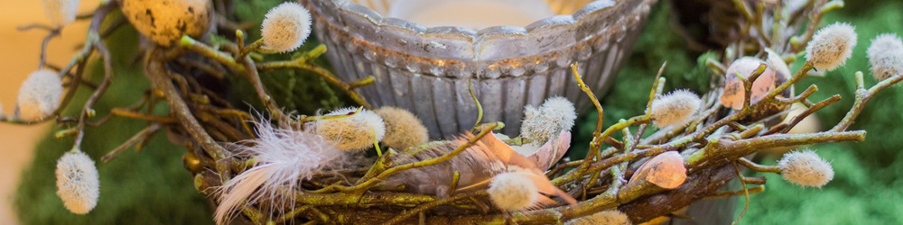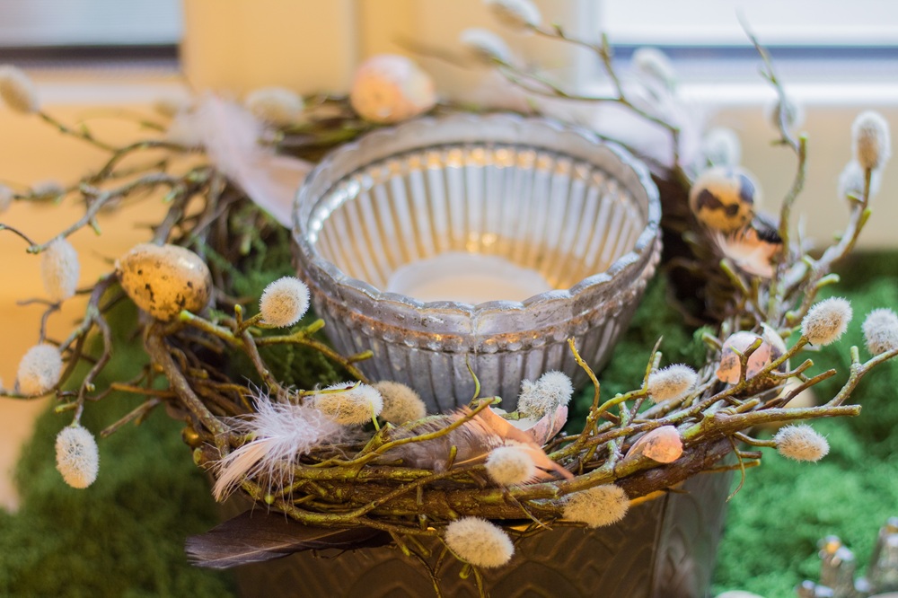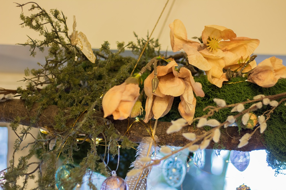 Im oberen Teil habe ich Palmzweige und Kunstblumen in das Moos gesteckt und verschiedene Dekoeier aus Glas sowie Federn in die Leiter gehängt. Meine Schmetterlinge aus dieser Frühlingsdeko habe ich natürlich auch hier verwenden können.