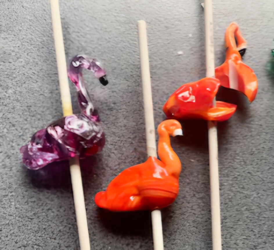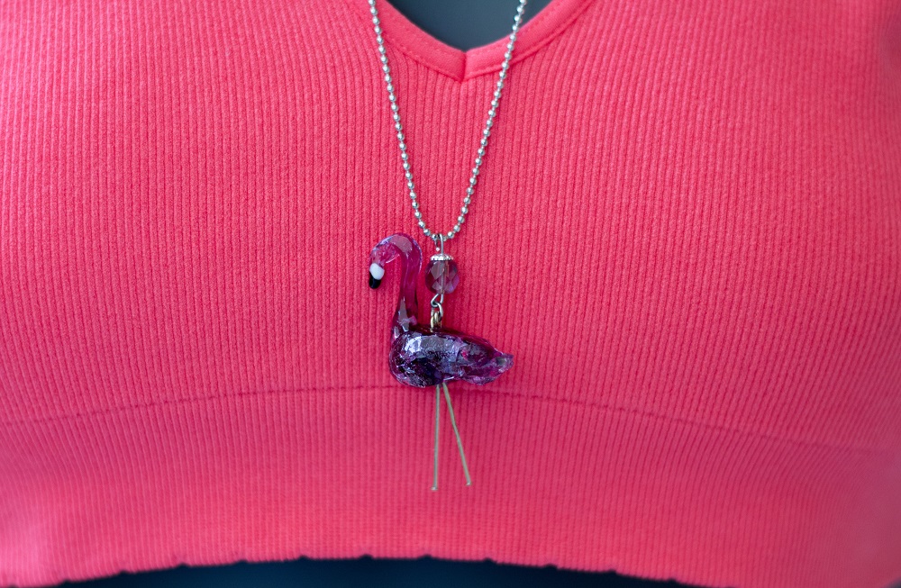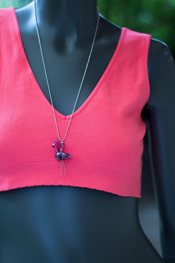 Vor wenigen Monaten habe ich begonnen, selbst Glasperlen zu machen. Dazu habe ich einen Einführungskurs in einer Werkstatt belegt und neben runden Perlen eine Erdbeere und einen Zahn geformt. Mein zweites Projekt war schon etwas ambitionierter, denn ich wollte für meine Schwester passend zur Flamingo-Bluse eine Kette machen. Die Kursleiterin meinte zu Beginn, dass das sehr ambitioniert sei, doch zum Schluss ist es doch geglückt! Ich habe Flamingos gemacht, in der Hoffnung, dass einer überlebt und so war es auch.
