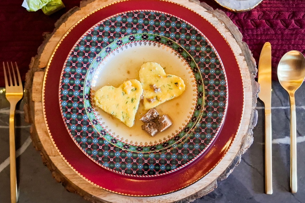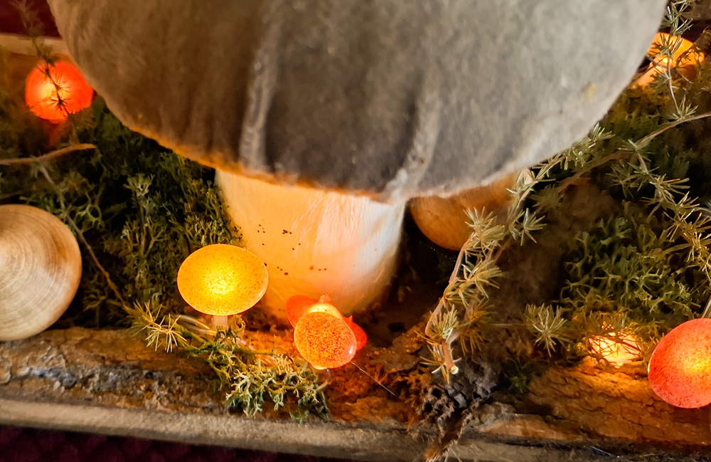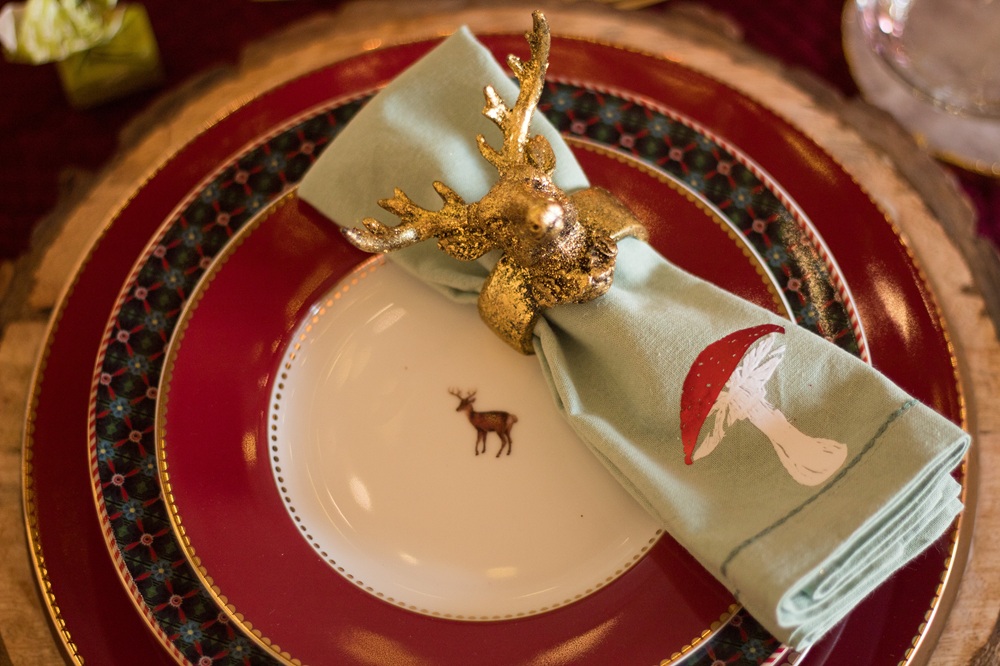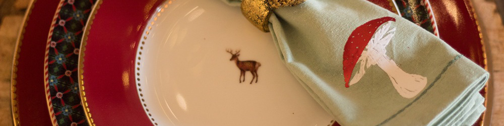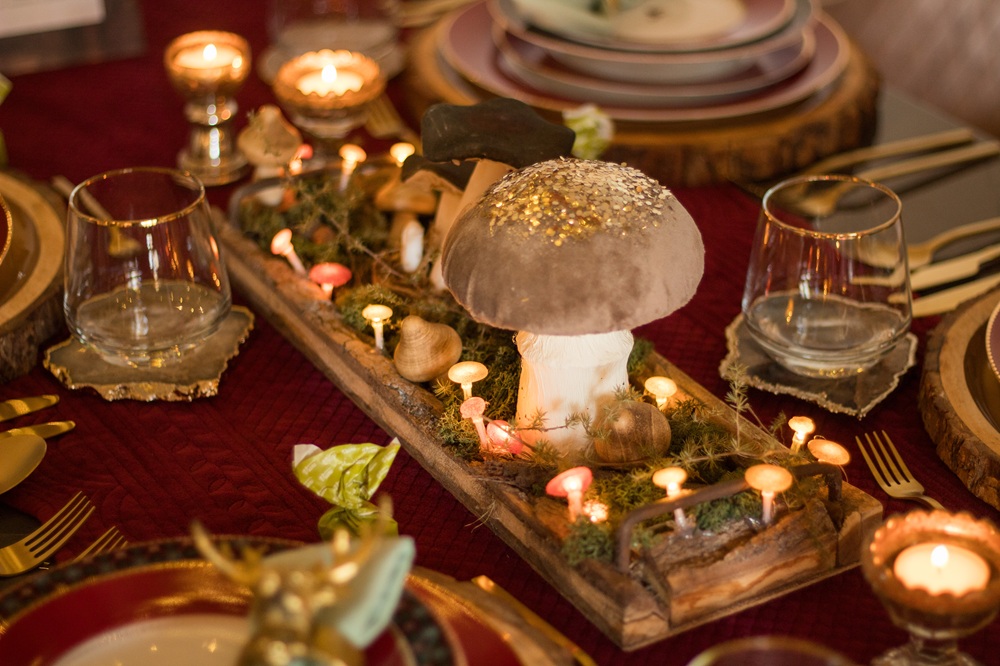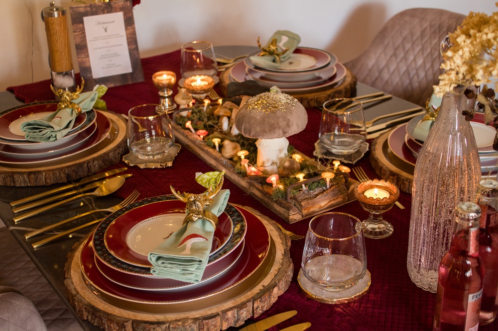 Da mein Service sechs Mal jeweils vier Teller umfasst, habe ich ein 4-Gänge-Menü vorbereitet, um alle Teller nutzen zu können. Die Servietten habe ich jeweils mit einem Pilz beplottet und mit einem Hirsch-Serviettenring drapiert. Die Tischdeko besteht aus einem Holztablett als Centerpiece, dort habe ich aus einer Lichterkette und bunten Heißklebepatronen kleine Pilze gebastelt. Das Tablett ist mit Islandmoos und Pilzen dekoriert und hat zusammen mit ein paar Kerzen eine schöne Lichtstimmung verbreitet.