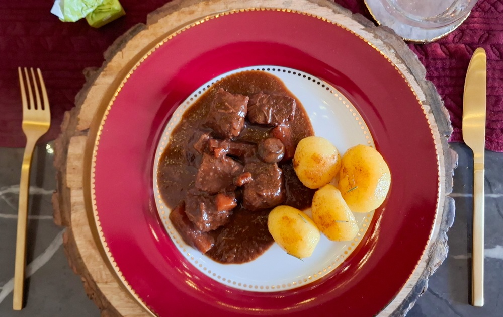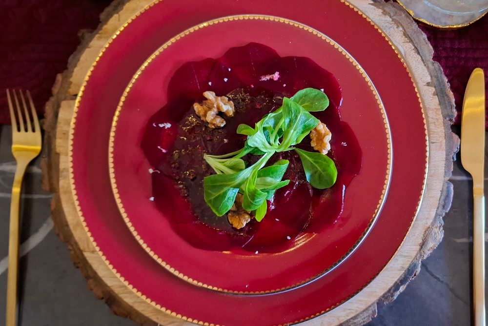 Die vier Gänge des Menüs umfassten als Vorspeise Carpaccio von der roten Bete mit Feldsalat, Meerrettich und Walnüssen, als Suppe eine klare Brühe mit Kräuterschöberl, ein Bœuf bourguignon mit Rosmarinkartoffeln als Hauptgang und Petit fours mit Mandeln und Quitte als Dessert.