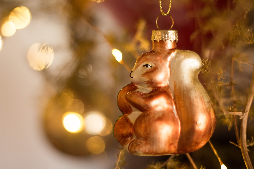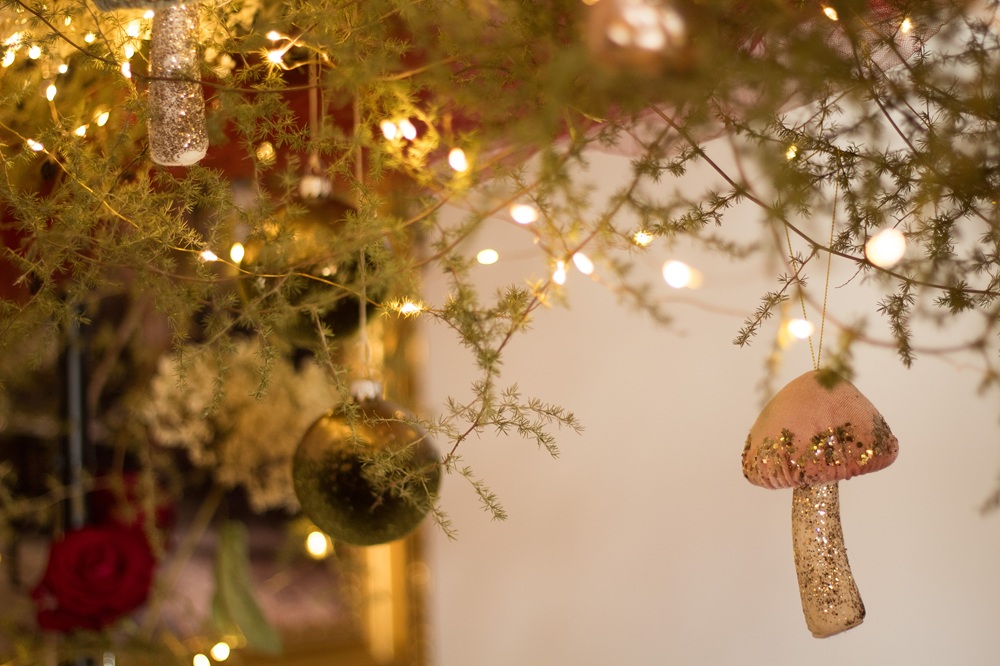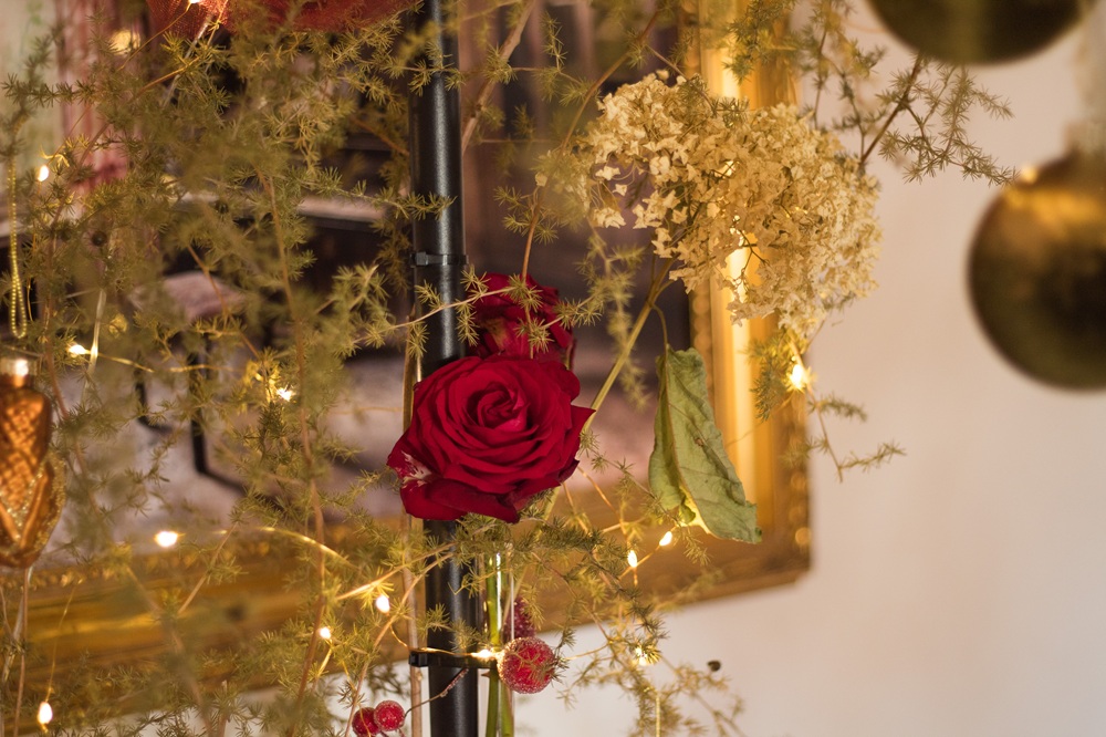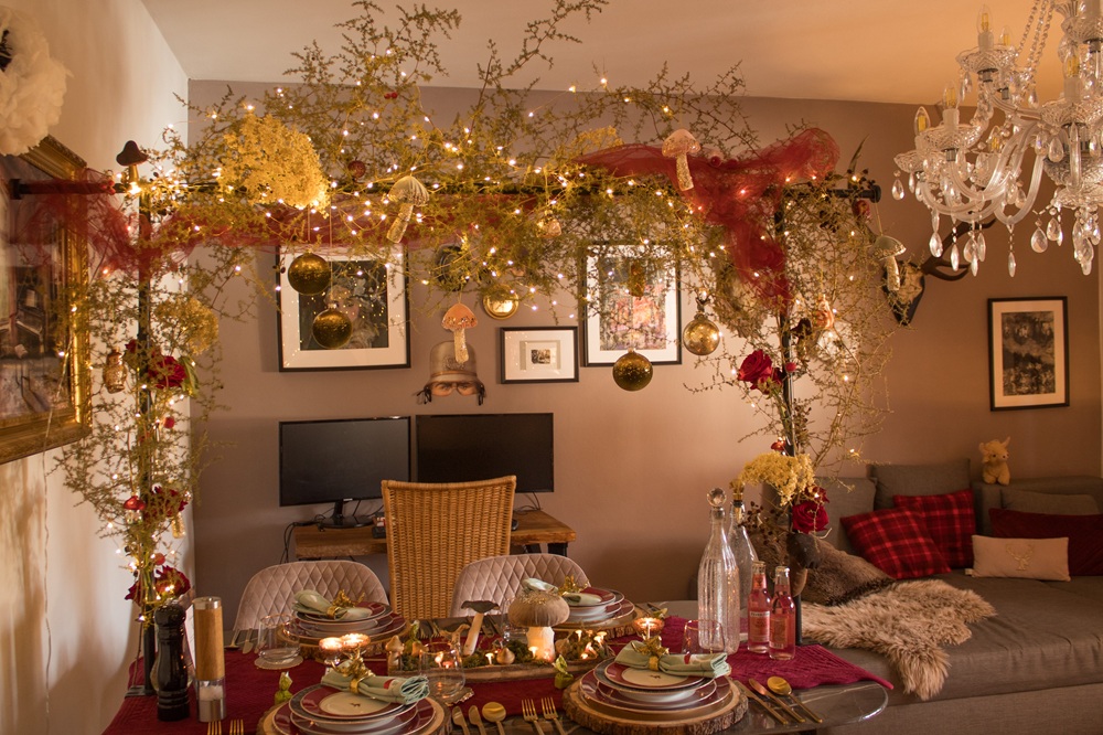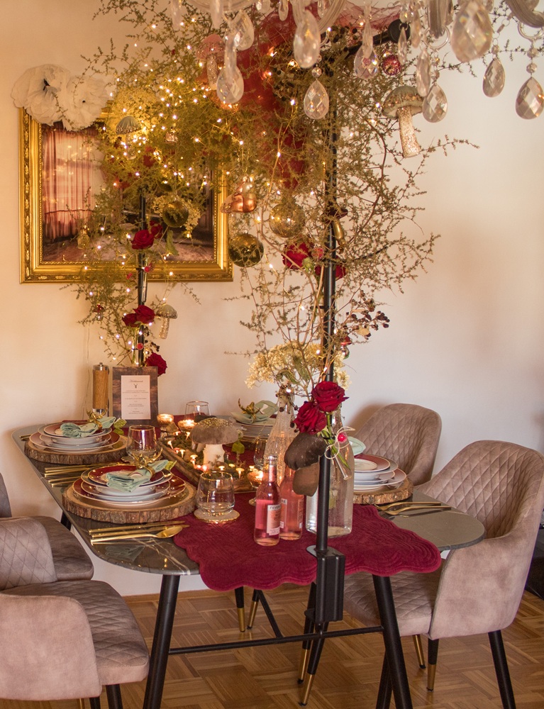 Den Tisch habe ich mit meiner Dekostange dekoriert, an der ich Asparagus, getrocknete Hortensien, rote Rosen und eine Lichterkette angebracht habe. Kleine Kugeln wie Igel, Eichhörnchen und Eulen sowie Pilze und Äpfelchen haben die Dekoration vervollständigt.