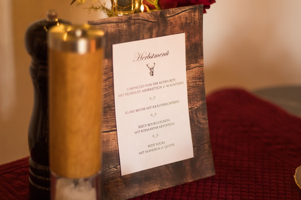 Zu meinem Geburtstag habe ich im Sommer ein schönes Service geschenkt bekommen, das sich perfekt für ein Herbst- oder Wintermenü eignet. Da ich dieses Jahr zu Weihnachten in rosa und nicht wie sonst in rot dekorieren möchte, habe ich die dunkelroten Samtgardinen, die karierten Kissen und meinen roten Tischläufer schon im Herbst ausgepackt und dekoriert. Passend dazu fand nun ein Herbstmenü statt.