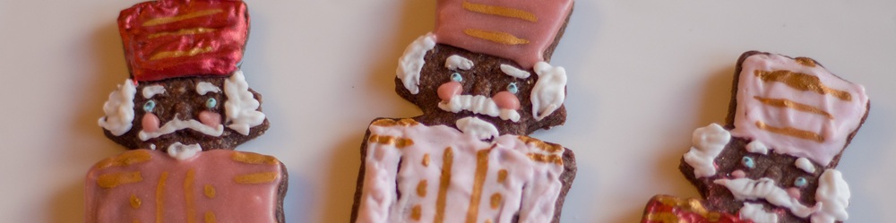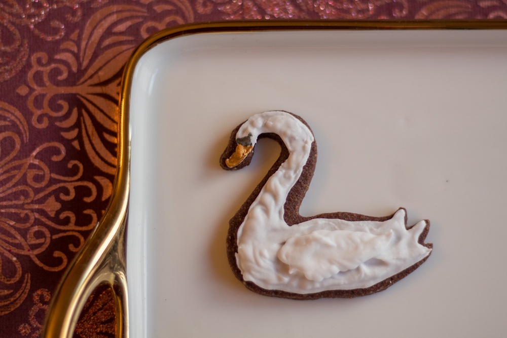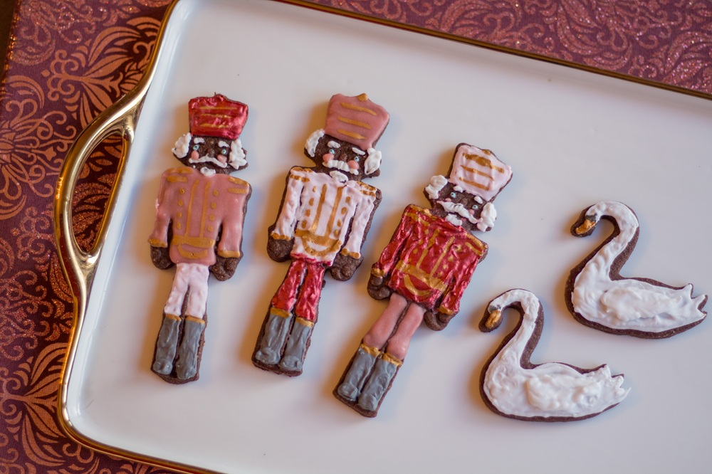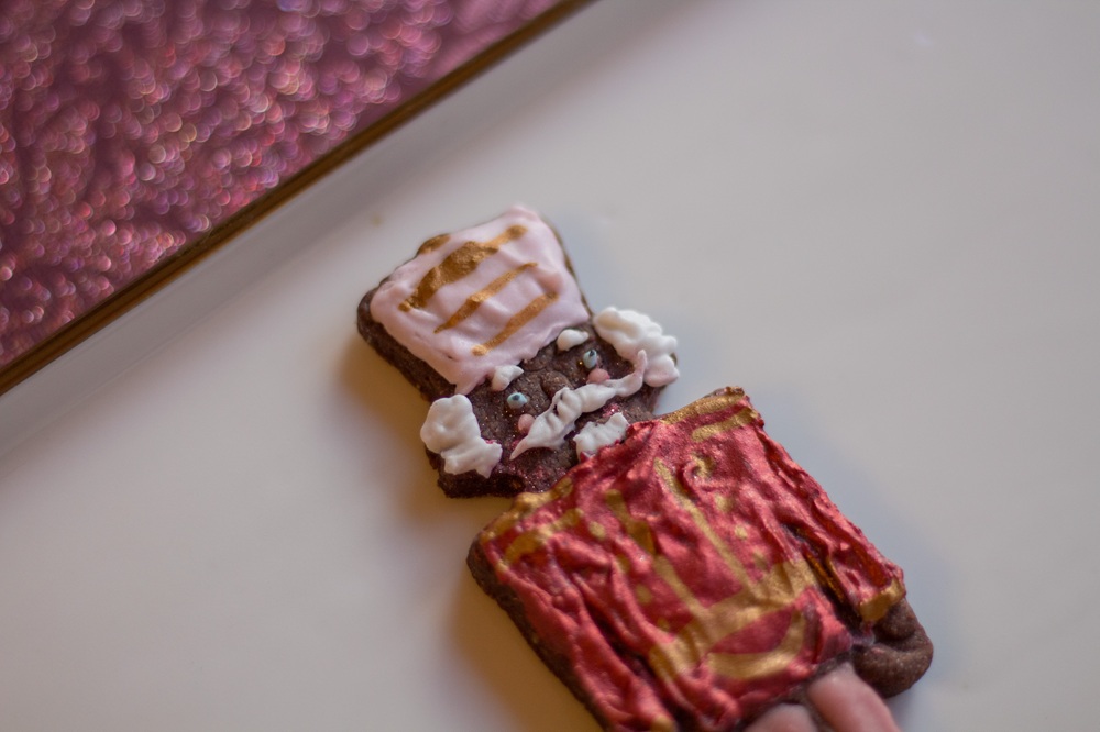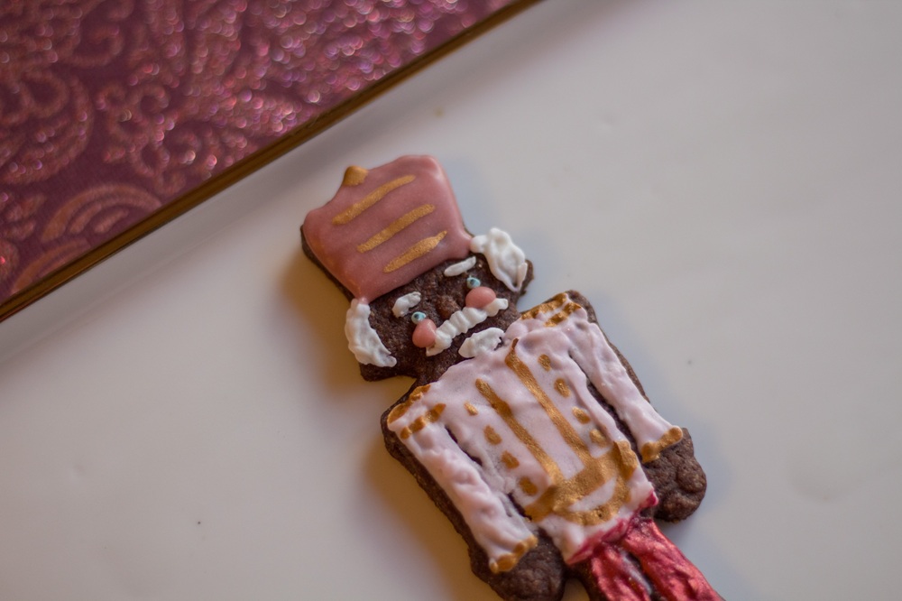 Das Eiweiß mit Zitronensaft aufschlagen und den Puderzucker unterrühren. In drei Teile teilen und zwei davon in helles bzw. dunkles Rosa einfärben, einen kleinen Teil der übrigen weißen Glasur hellblau färben. Die Glasur jeweils in einen Spritzbeutel füllen, die Spitze abschneiden und die Kekse verzieren. Für die dunkelroten Kleidungsstücke habe ich Lebensmittelpuder mit etwas Amaretto vermengt und mit einem Pinsel aufgetragen. Auch für die goldenen Verzierungen habe ich diese Technik verwendet. Die Augen der Nussknacker und des Schwans habe ich mit einem Lebensmittelstift aufgemalt.
