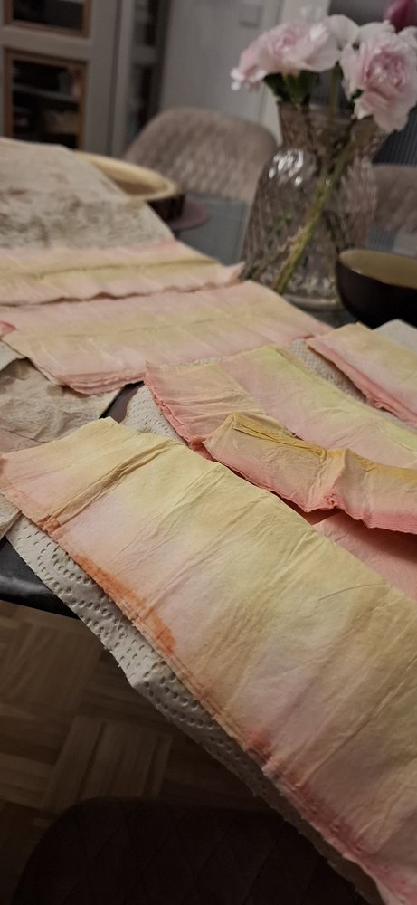 - Die Blätter einer schmalen Küchenrolle an der langen Seite falten. Die offene Seite in helle Farben eintauchen, die geschlossene in Grün- oder Gelbtöne, denn diese Seite ist der Stempel. Die offene Seite kann man mit einem Pinsel mit intensiverer Farbe bemalen, denn das sind die äußeren Ränder des Blütenblatts. Die Blätter trocknen lassen.