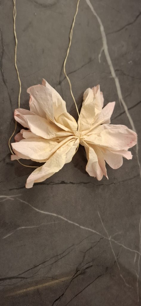 - Die zusammengefalteten Blätter mit einem Stück Stickgarn zusammenknoten.