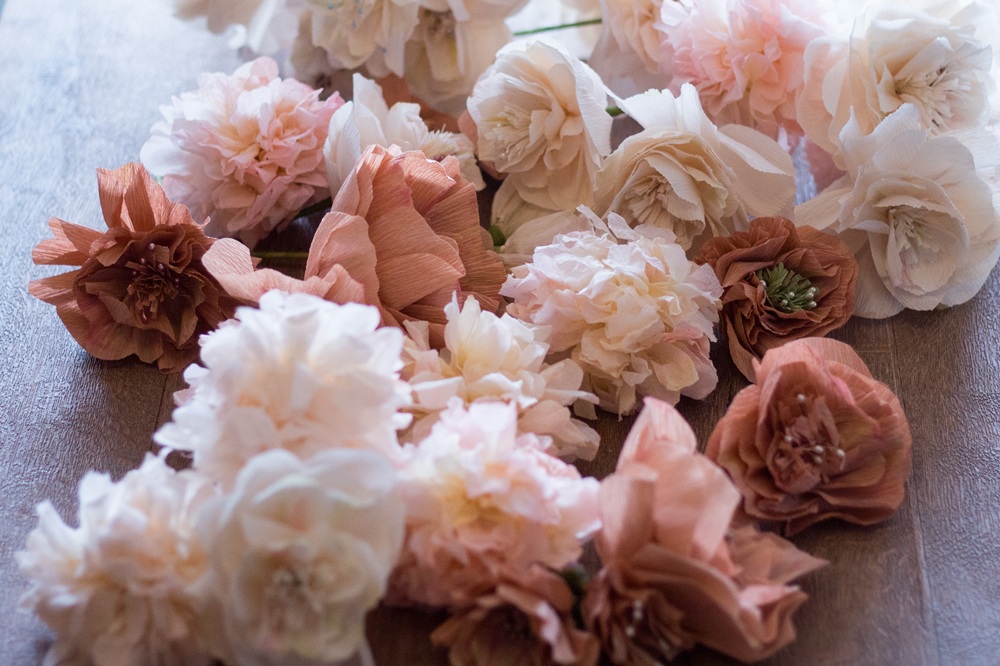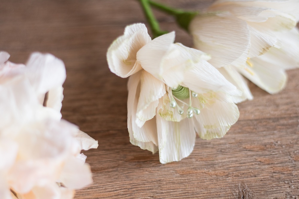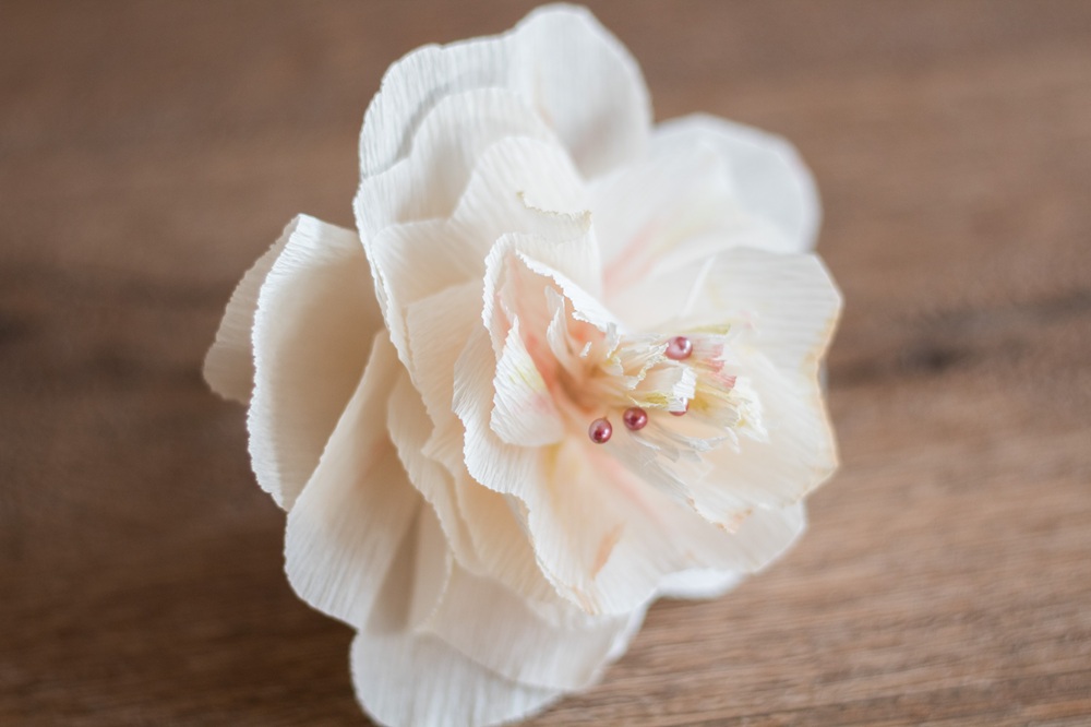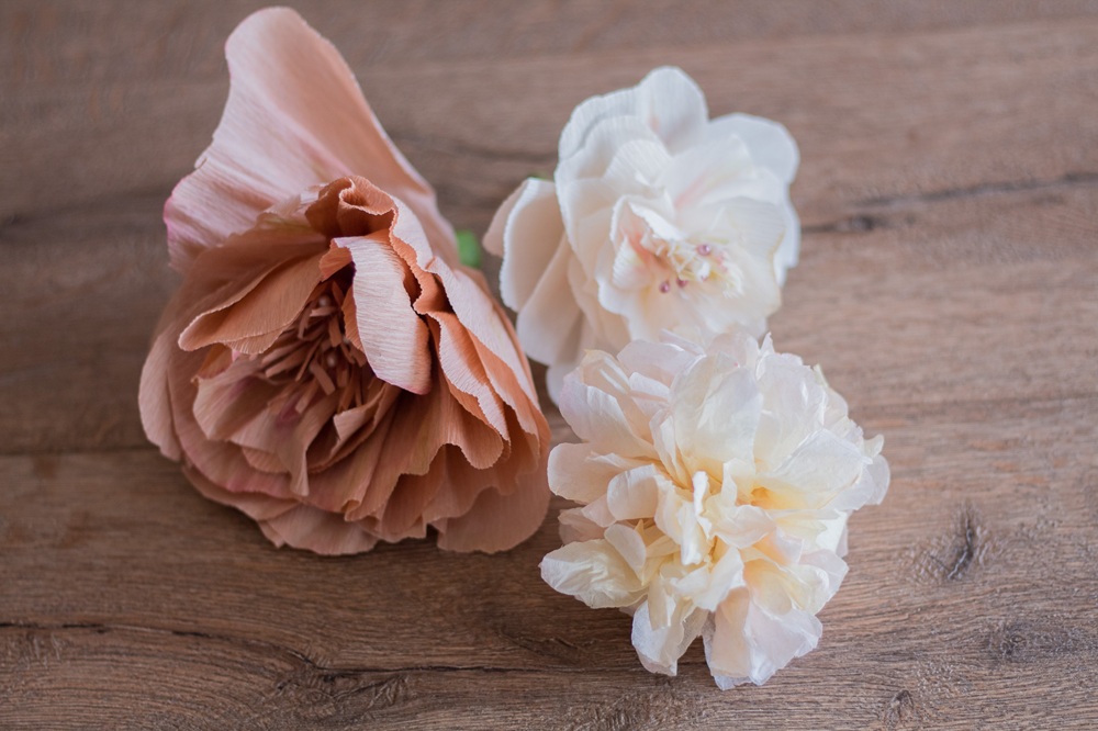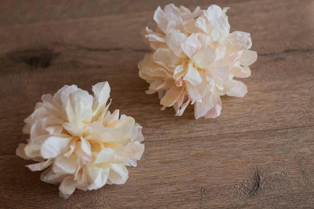 Die Hortensien habe ich nicht aus Krepppapier, sondern aus Küchenpapier gemacht. Dafür färbt man Wasser mit Aquarellfarben, ich habe eine Mischung aus gelb-grün und zarten Rottönen verwendet. Mit der untenstehenden Anleitung kann man die Hortensien in Kugelform ganz leicht selber machen.