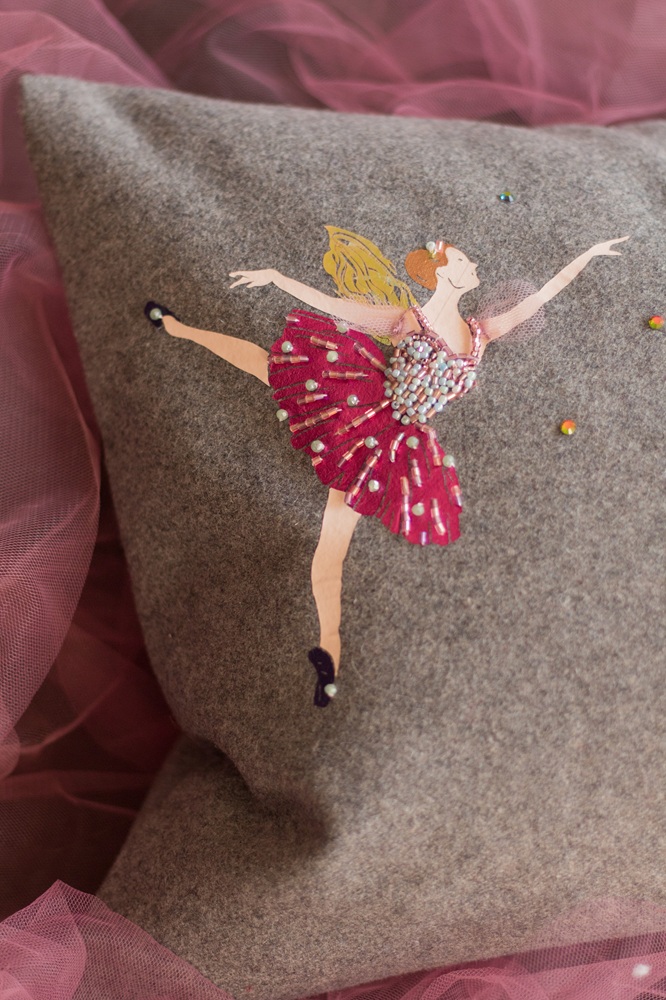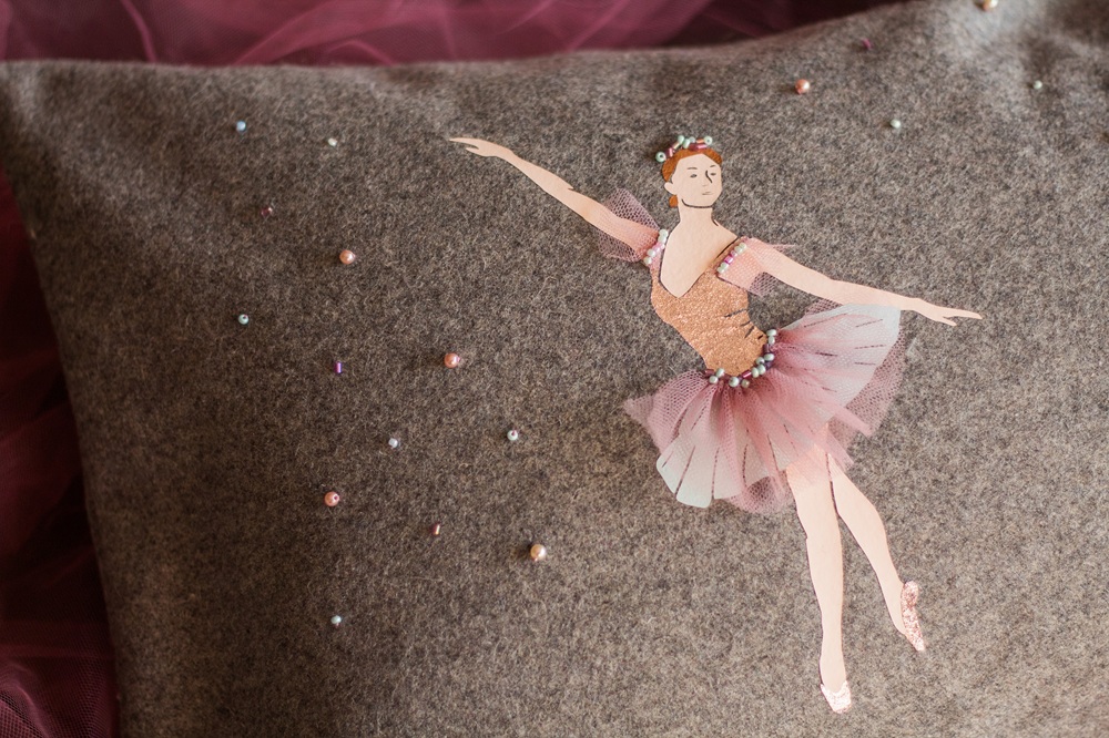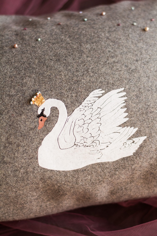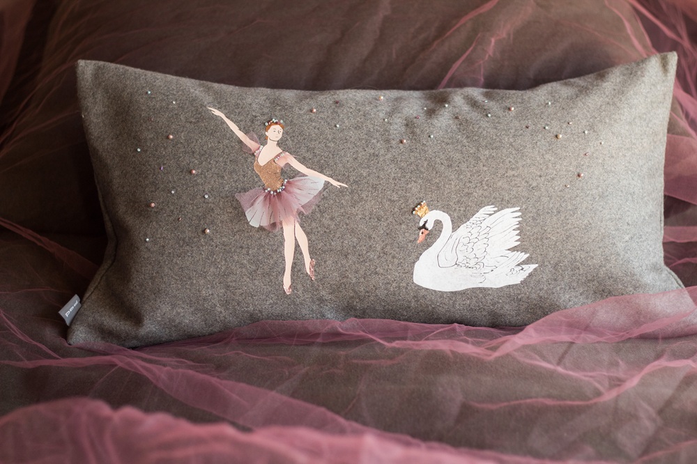 Das Schwanenseekissen ist etwas schlichter gehalten, es besteht nur aus Odette und dem Schwan. Für die Ballerina habe ich neben der Textilfolie auch Tüll auf das Tutu genäht und alles mit Perlen verziert.