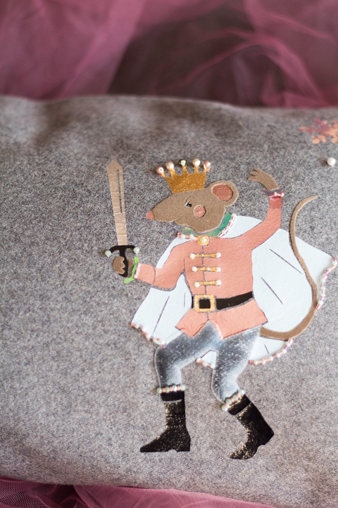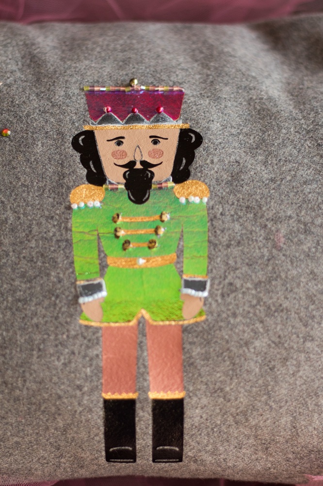 Eigentlich hatte ich für dieses Kissen nur den Nussknacker und den Mausekönig geplant. Da ich die Figuren aber in so ungünstigem Abstand auf das Kissen gebügelt hatte, dass sie total schief und unausgeglichen gewirkt haben, habe ich noch eine Zuckerfee und die Tänzerinnen des Schneeflockenwalzers dazu gemacht. Den Nussknacker habe ich schon einmal für weihnachtliche Babybodys designt, ihn konnte ich also einfach in der Größe anpassen und direkt plotten. Die Tänzerinnen und den Mausekönig habe ich neu gezeichnet, die Dateien der Ballerinen finden sicher auch einmal für Kindershirts Verwendung.