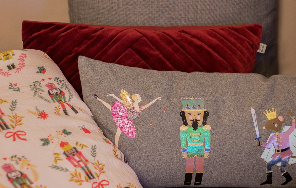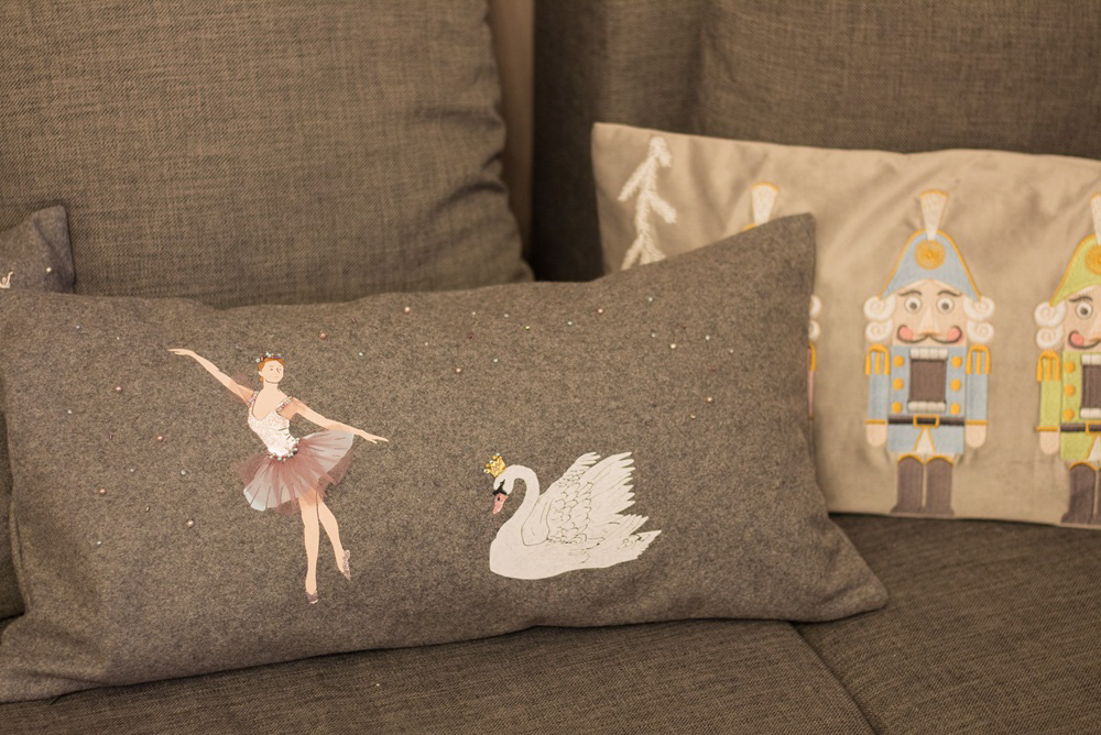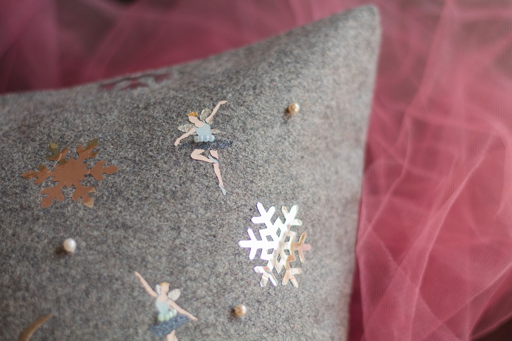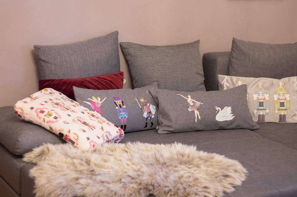Diese Kissen zum Thema Nussknacker und Schwanensee waren die ersten Stücke, die ich für mein diesjähriges Weihnachtsmotto entworfen habe. Die Motive sind selbst gezeichnet, mit dem Plotter aus Textilfolie geschnitten und mit einer Bügelpresse auf die Kissen aufgebracht. Danach habe ich alle Figuren mit Perlen bestickt.
